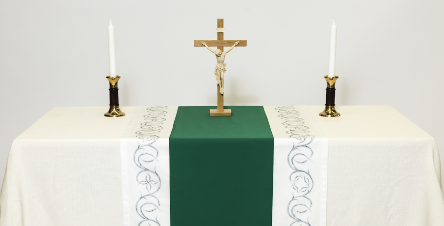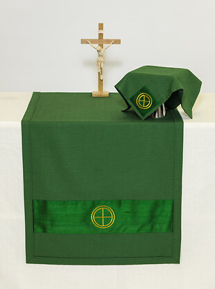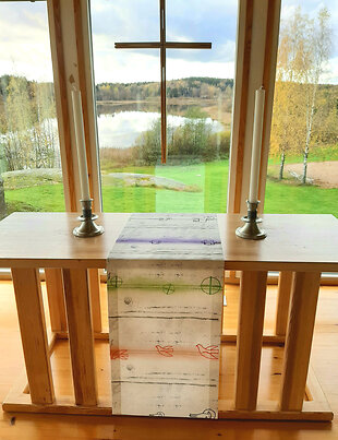 Ateljé Solemniksesta löydät monia valmiita ja helppoja ratkaisuja kirkkoihin ja seurakuntatiloihin. Valmistamme antependiumit ja kirjaliinat, hiljentymishuoneen tekstiilit ja sisustustuotteet, joiden kristillinen symboliikka vahvistaa omalta osaltaan kirkon sanomaa.